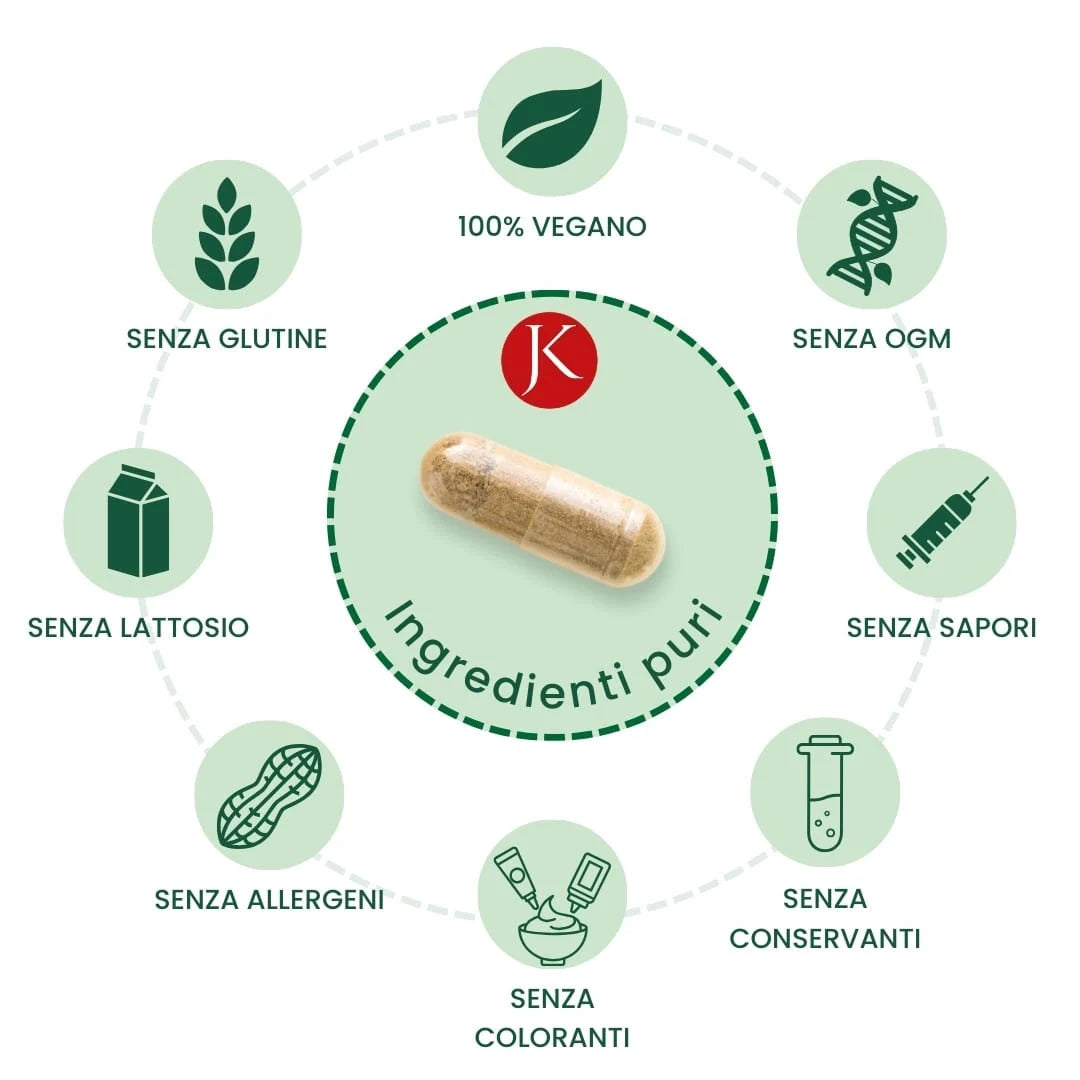 Ossido di magnesio, idrossi-propil-metilcellulosa (capsula vegetale), Althea officinalis L. (folium), verbascum densiflorum bert. (folium), Pulmonaria officinalis, inula helenium L. (radix), pimpinella anisum L. (fructus), lobaria pulmonaria hoffm. (thallus), eucalyptus globulus labill. (folium), Vitamina C (acido L-ascorbico), Vitamina E (DL-alfa-tocoferilacetato), marrubium vulgare L (herba), abies alba mill. (folium), L-cisteina cloridrato, thymus vulgaris L. (folium), hyssopus officinalis L. (folium), Vitamina A (acetato di retinile), agenti antiagglomeranti (sali di magnesio degli acidi grasse), addensanti (gomma di guar)