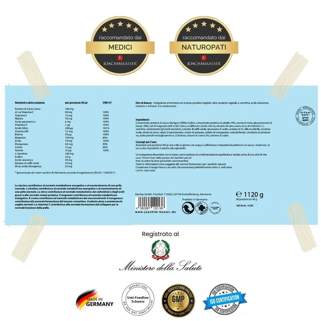 Ingredienti: Concentrato proteico di zucca biologica (48%), inulina, concentrato proteico di pisello (4%), aroma di mela, glucomannani di konjac (3%), sali di magnesio dell’acido citrico, acidificante (acido citrico), estratto di camu camu ricco di vitamina C, L-carnitina, edulcorante (glicosidi steviolici), estratto di caffè verde, ialuronato di sodio, acetato di DL-alfa-tocoferile, nicotinamide, citrato di zinco, calcio D-pantotenato, citrato di potassio, solfato di manganese, colecalciferolo, cloridrato di piridossina, acido pteroil-monoglutammico, D-biotina, cloruro di cromo (III), selenito di sodio.