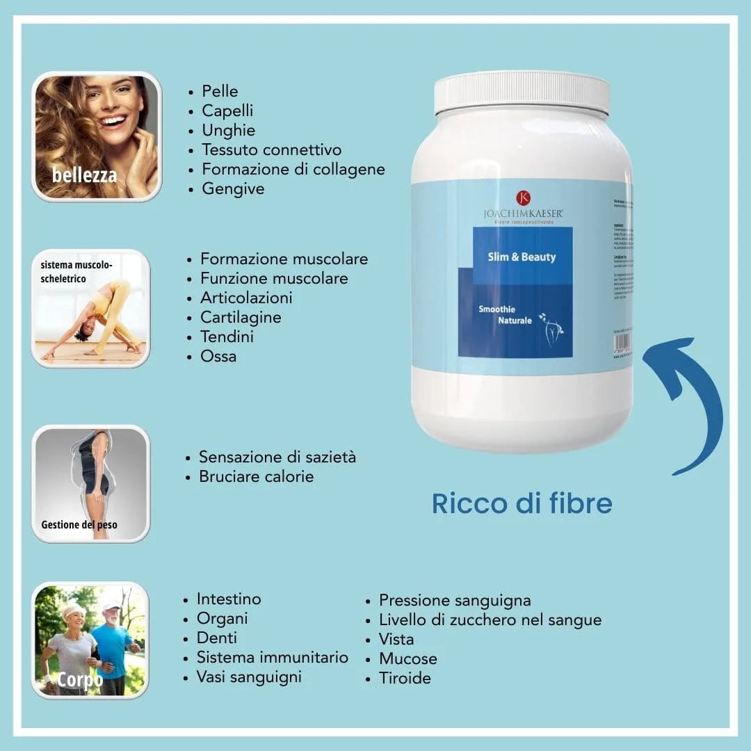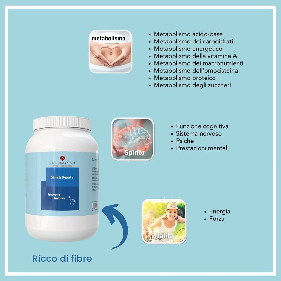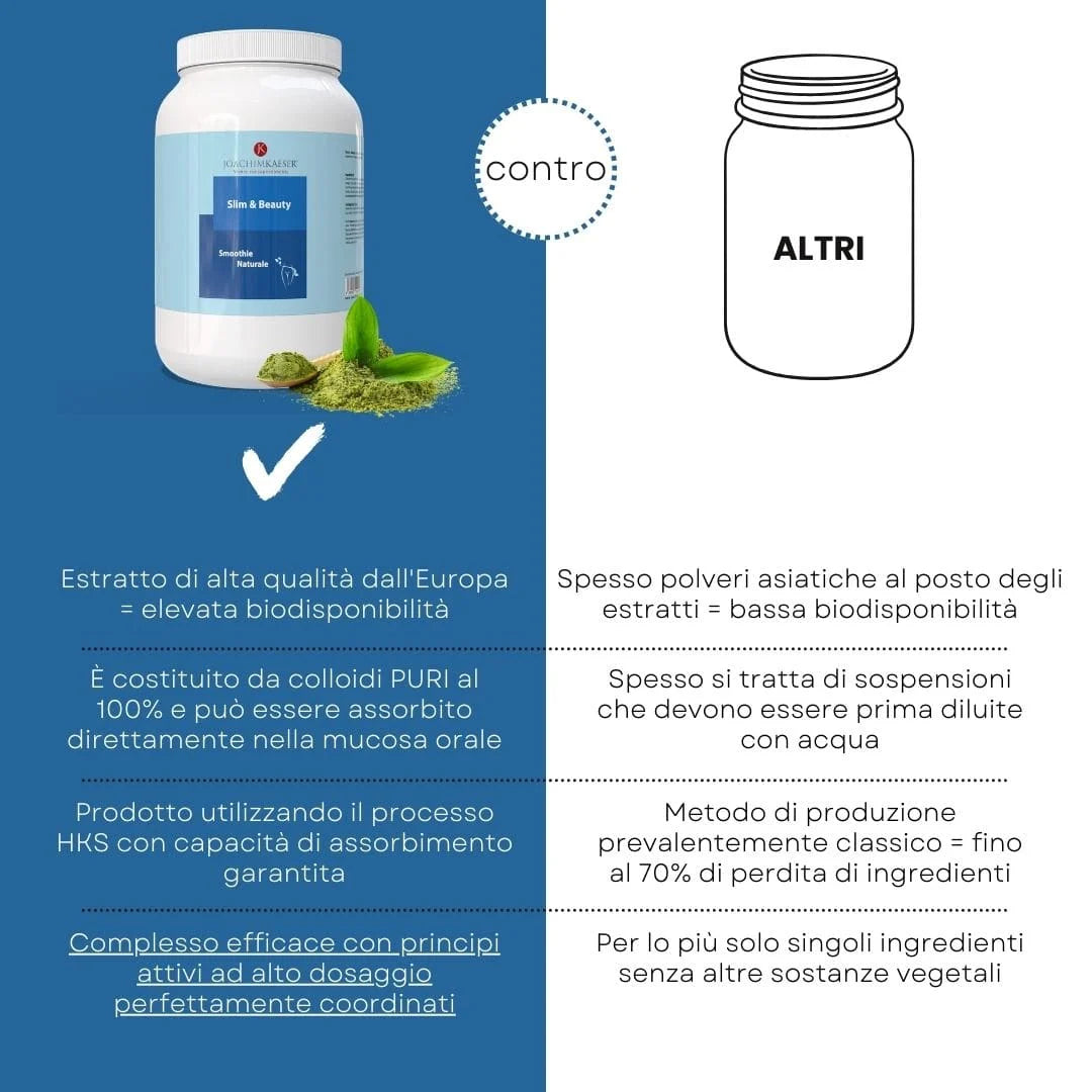 Slim & Beauty è più di un semplice integratore: è una formula sinergica che combina ingredienti selezionati per sostenere la linea, la bellezza della pelle e il metabolismo. Grazie al processo di idro-colloidalizzazione, i nutrienti vengono resi altamente biodisponibili e protetti, per un'assimilazione ottimale.