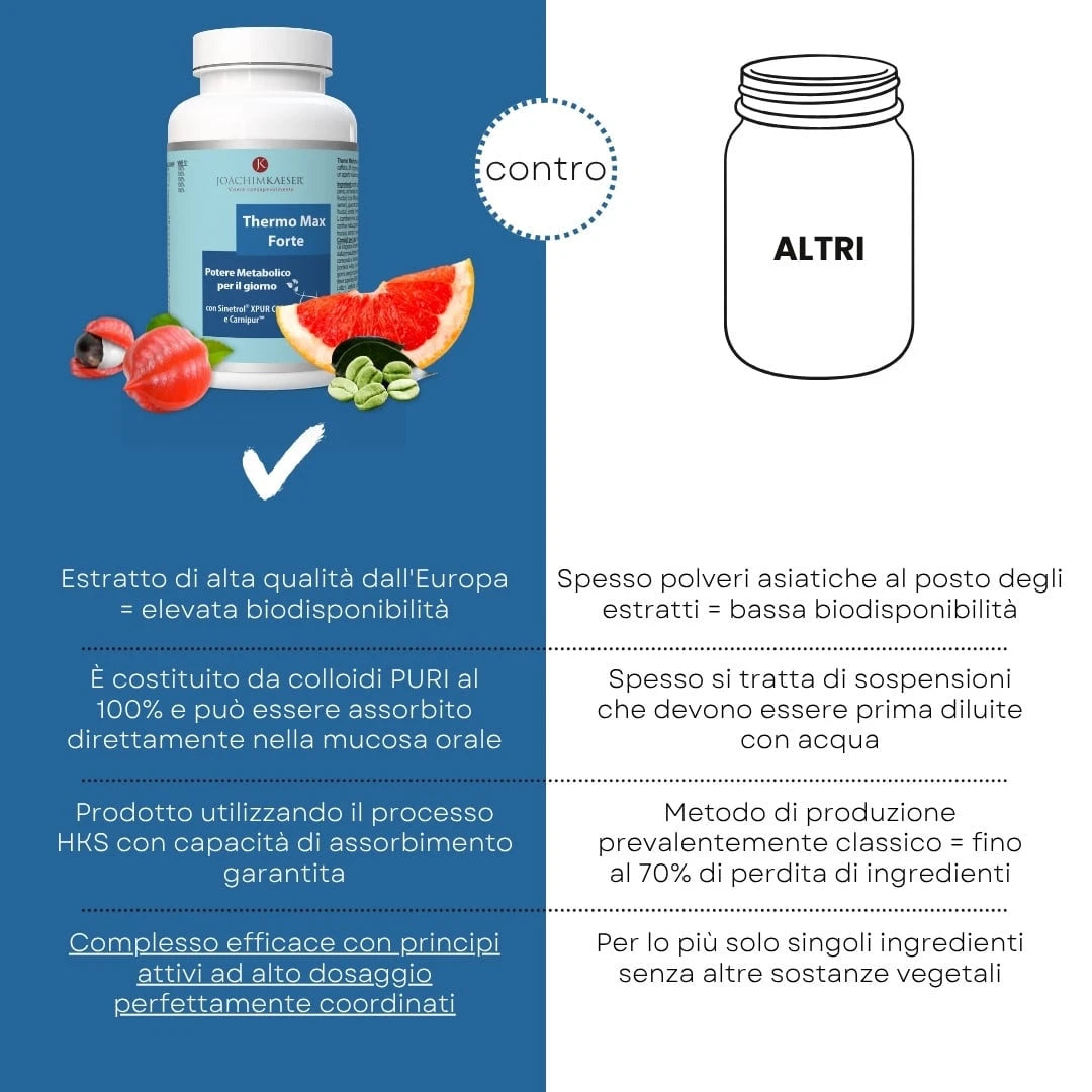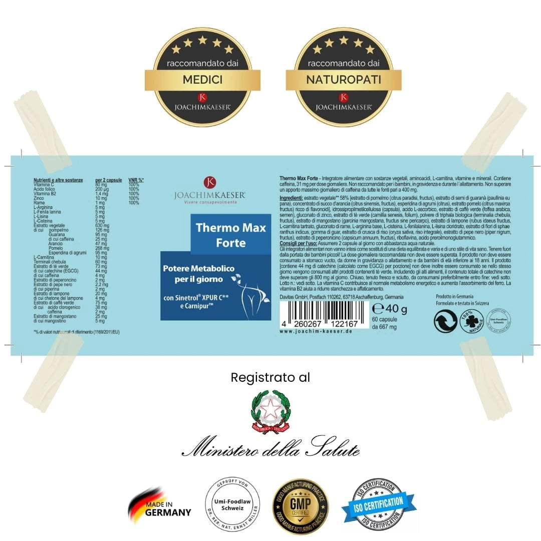 Thermo Max Forte è l'integratore ideale per chi vuole migliorare la composizione corporea in modo naturale. Grazie a due attivi brevettati – Sinetrol® (polifenoli agrumati + caffeina naturale) e ForsLean® (Coleus forskohlii) – stimola la termogenesi e promuove la perdita mirata di grasso, in particolare nella zona addominale.