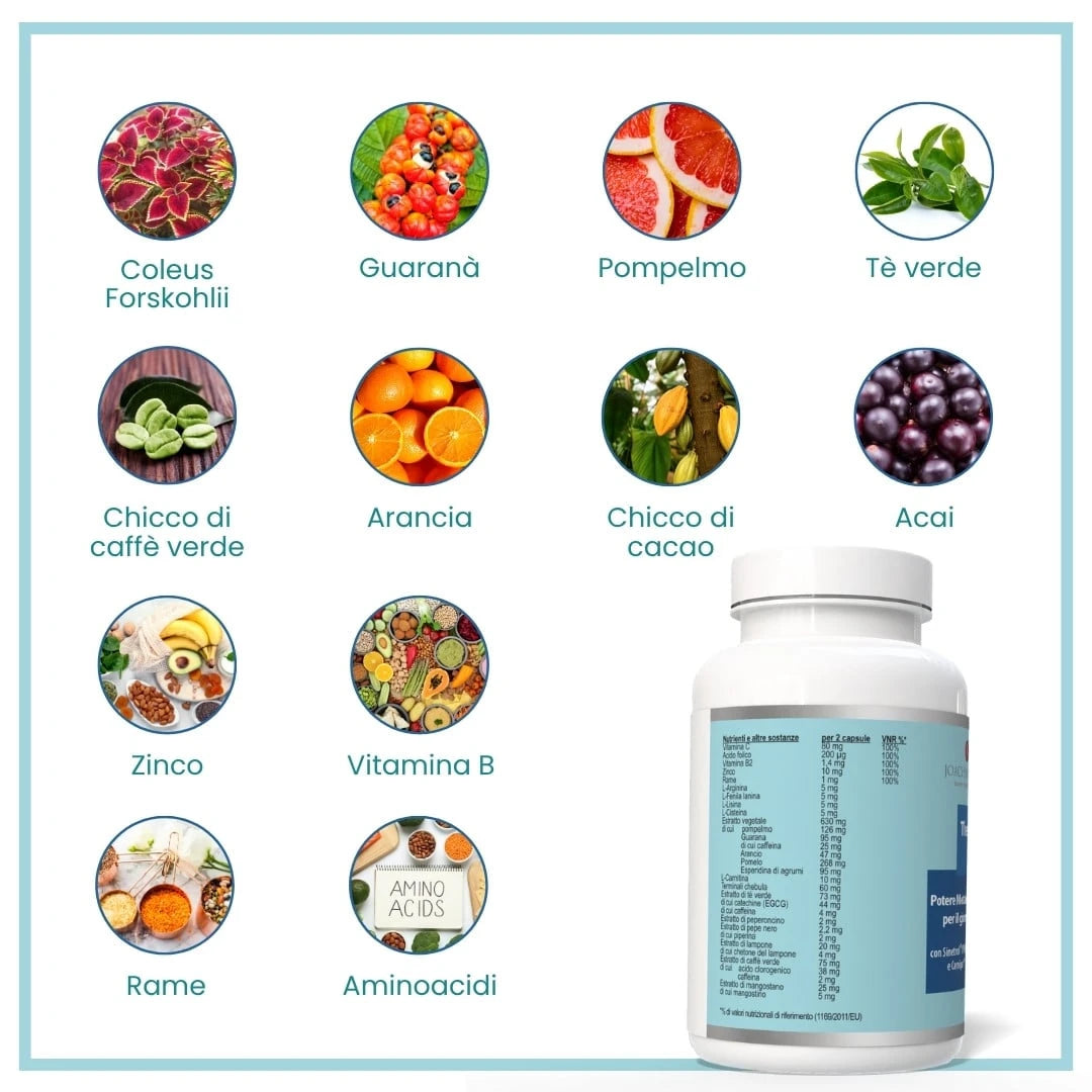 Estratto vegetale** 58% [estratto di pomelmo (citrus paradisi, fructus), estratto di semi di guaranà (paullinia eu pana), concentrato di succo d'arancia (citrus sinensis, tructus), esperidina di agrumi (citrus), estratto pomelo (citrus maxima fructus) ricco di flavonoidi], idrossipropilmetilcellulosa (capsula), acido L-ascorbico, estratto di caffe verde (foffea arabica, semen), gluconato di zinco, estratto di tè verde (camillia senesis, folium), polvere di triphala biologica (terminalia chebula, fructus), estratto di mangostano (garcinia mangostana, fructus sine pericarpo), estratto di lampone (rubus idaeus fructus, L-camitina tartrato, gluconato di rame, L-arginina base, L-cisteina, L-fenilalanina, L-lisina cloridrato, estratto di fiori di sphae ranthus indicus, gomma di guar, estratto di crusca di riso (oryza sativa, riso integrale), estratto di pepe nero (piper nigrum, fructus), estratto di peperonicino (capsicum annuum, fructus), riboflavina, acido preroilmonoglutammico.