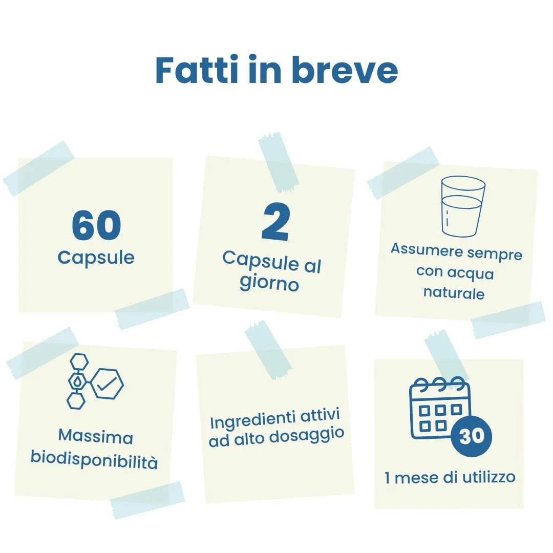 Assumere 2 capsule al giorno, esclusivamente a stomaco pieno, preferibilmente dopo colazione o pranzo, con un bicchiere d’acqua.