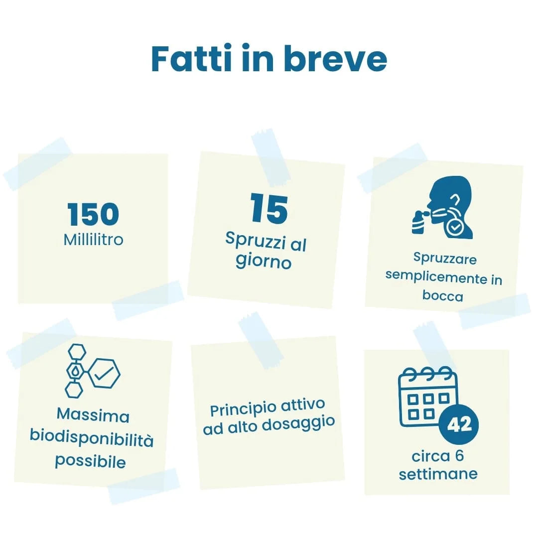 Spruzza 1 volte al giorno 15 spruzzi, direttamente sotto la lingua. Non superare la dose giornaliera consigliata.